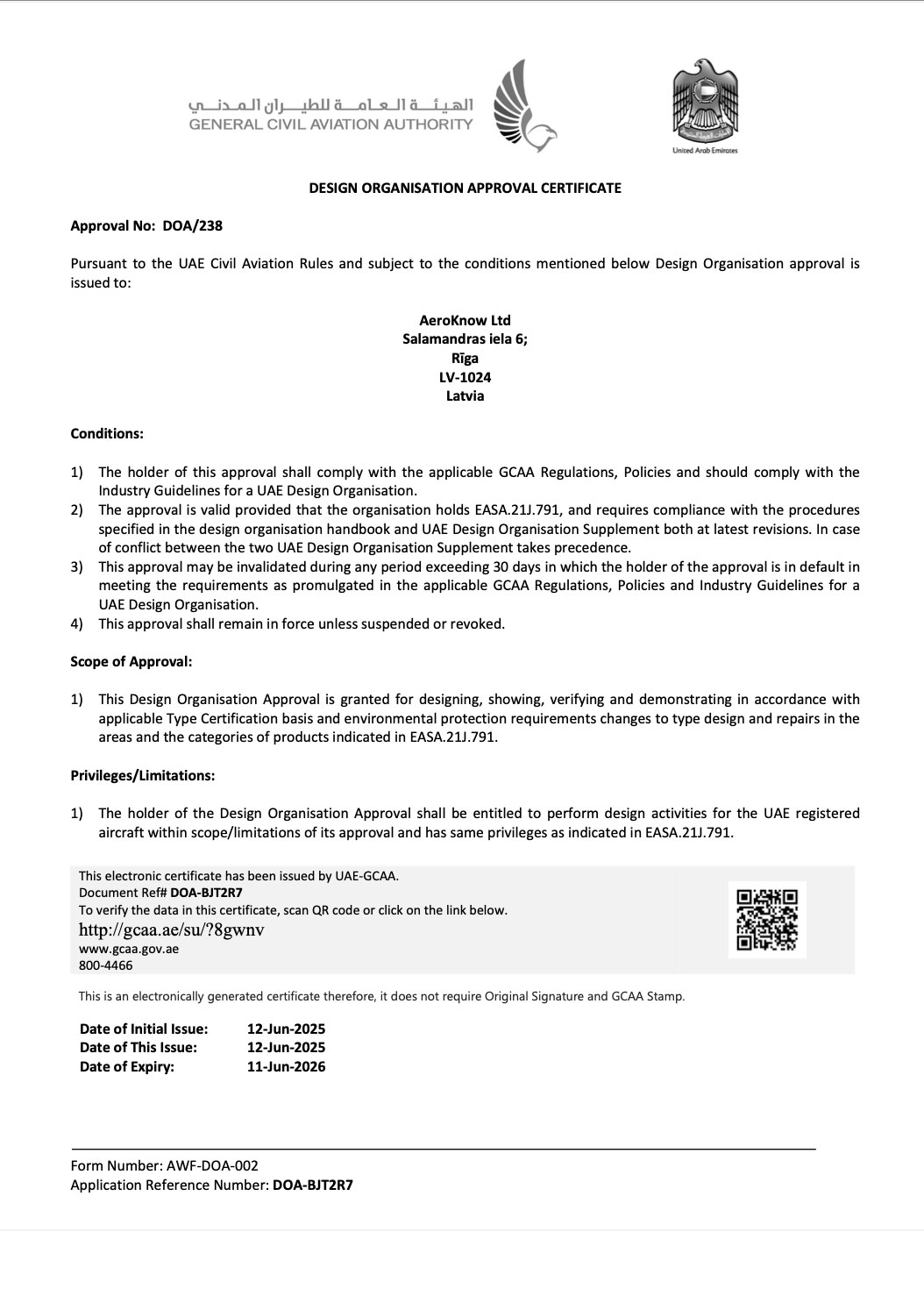 AeroKnow SIA is a Latvian-based EASA Part 21J and Part 21G holding company, with privileges from EASA and GCAA UAE to perform Minor Repairs and Minor Modifications large and small aeroplanes and large and small rotorcrafts, as well as to fabricate minor cabin interior components. The company has recently expanded its presence to South Asia by establishing a Regional Design Office in Colombo, Sri Lanka.